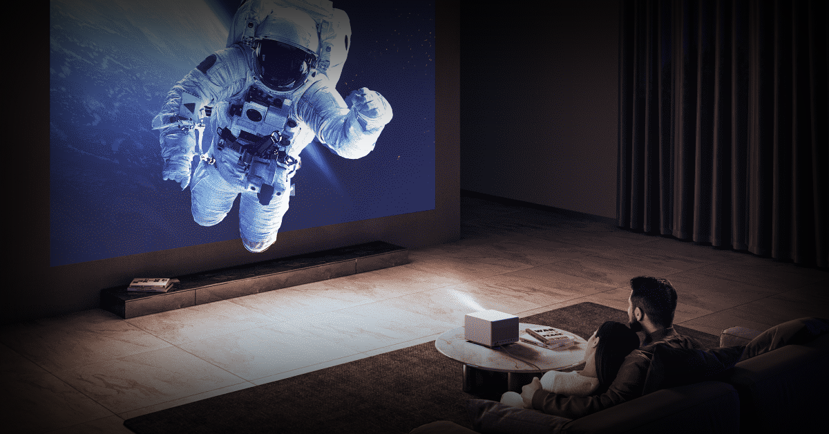 Enjoy crisp, vibrant visuals with Ultra HD projection. Perfectly bright and colorful images bring movies, games, and videos to life on any wall — up to 200″ big screen.”